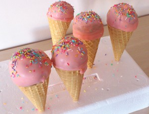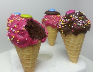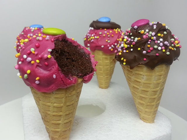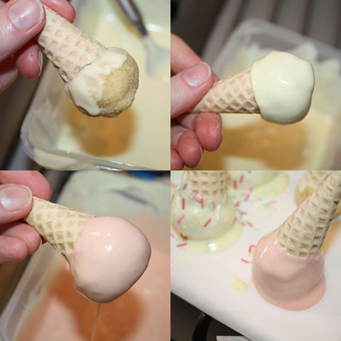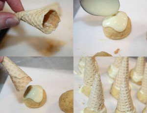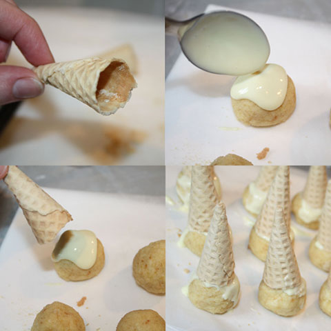 - Svaku kuglicu umočite malo u čokoladu i učvrstite u kornet.