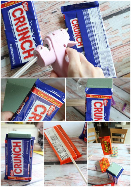 Treba vam i komad stiropora u koji ćete popikati štapiće te onda stiropor možete obložiti dodatno čokoladicama te sve zajedno ukrasiti mašnom ![]()