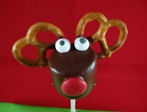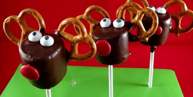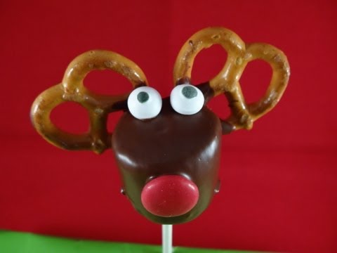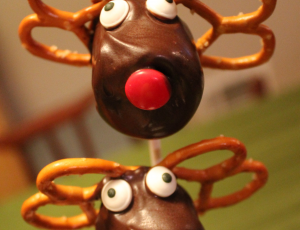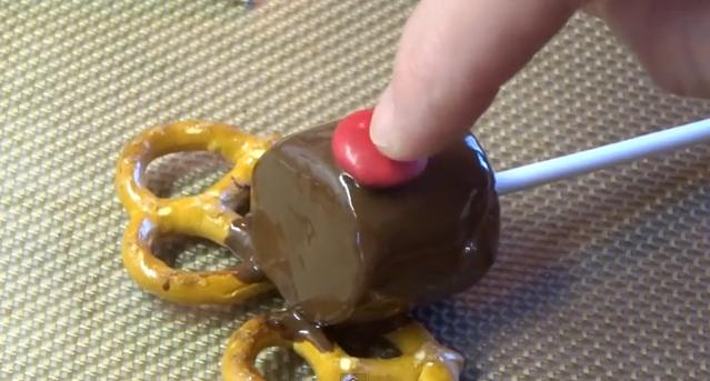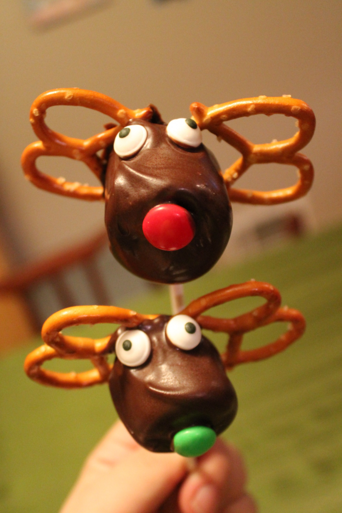 • Perec stavite jedan do drugog te bombon preliven čokoladom pritisnite na perece da biste napravili sobu rogove, a na sredinu sa druge strane stavite crveni bombon za nos.