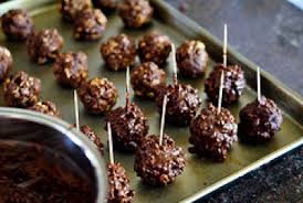 - Kada su kuglice spremne svaku nabodite na čačkalicu i umočite u rastopljeni čoko premaz.
