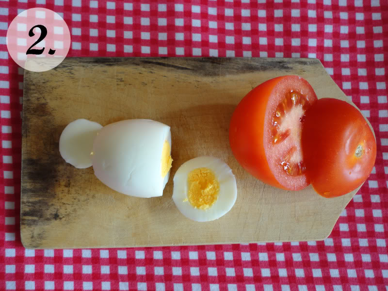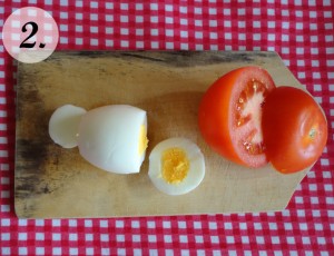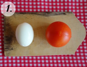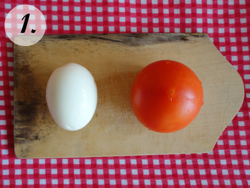 Rajčicama odrezati gornji i izdubiti sredinu što će predstavljati kapicu jajeta. Stavite malo majoneze na unutarnji dio rajčice – „kapice“ kako bi se „zaljepila“ na jaje a možete rajčicu i pričvrstiti sa čačkalicom.