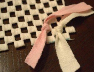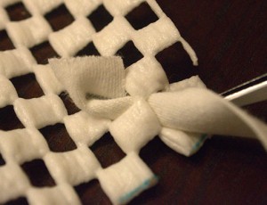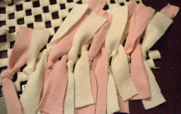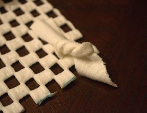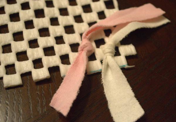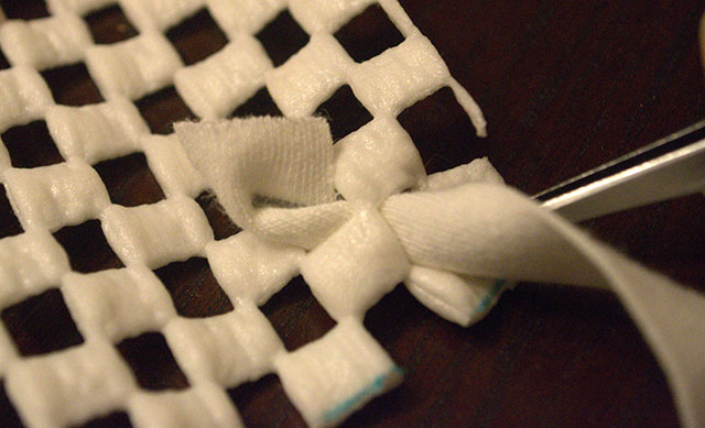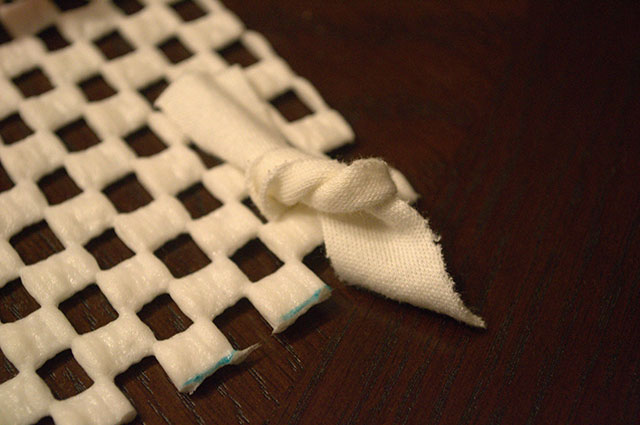 - Nakon što ste narezali sve trakice svaku trakicu provucite kroz gumenu mrežu i zavežite u čvor.