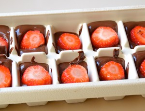 U svaki otvor nakon toga položite jednu jagodu i prelijte ostatkom čokolade do vrha tako da čokolada spoji sve prostore kako biste napravili jednu veliku čokoladu.