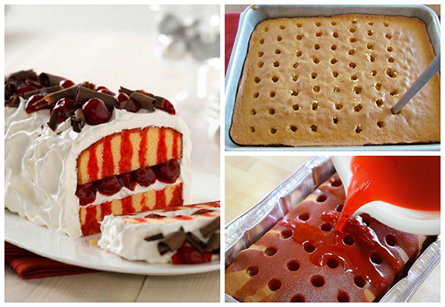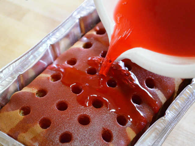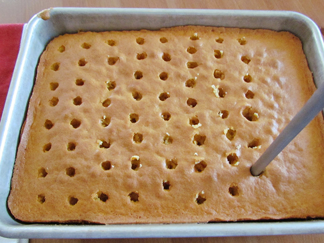 - Gotov biskvit ostavite da se ohladi i onda izbušite široke rupe u njemu, možete koristiti debelu slamku.