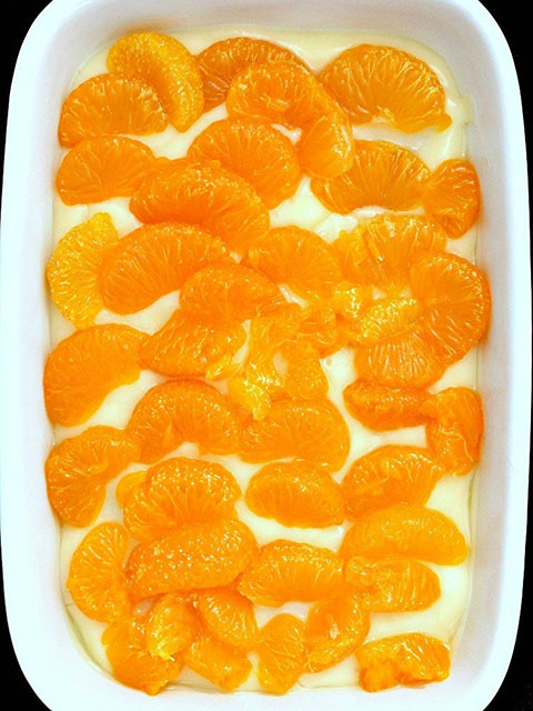 - Preko piškota prelijte polovicu kreme zatim složite mandarine pa sve zalijte ostatkom kreme i stavite na hlađenje.