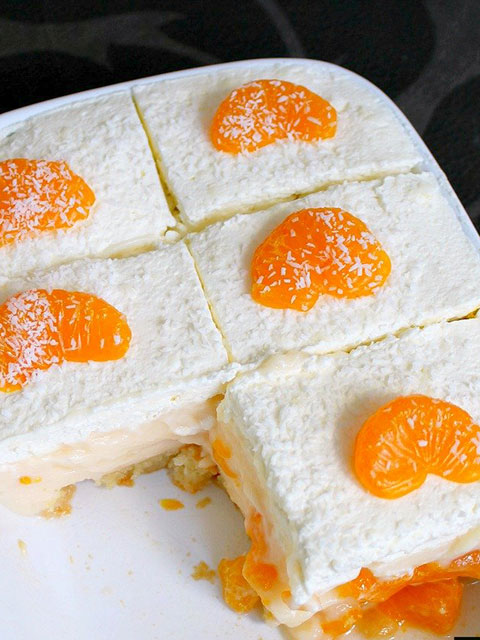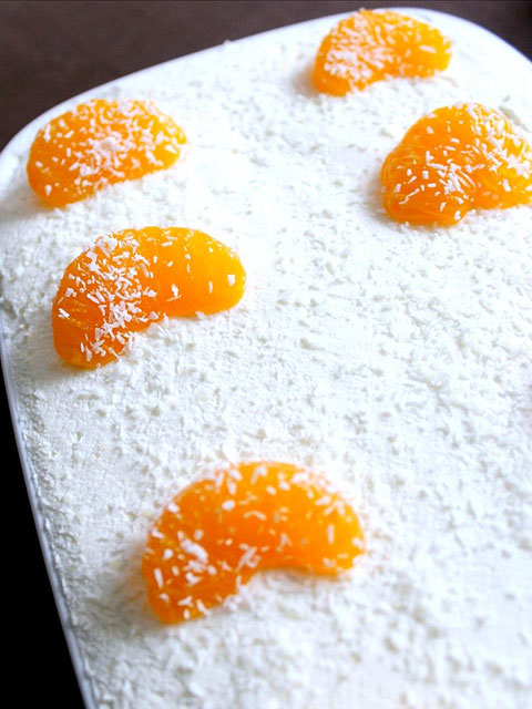 - Kolač premažite šlagom u koji ste umutili šećer u prahu i pospite kokosom te dekorirajte mandarinama.