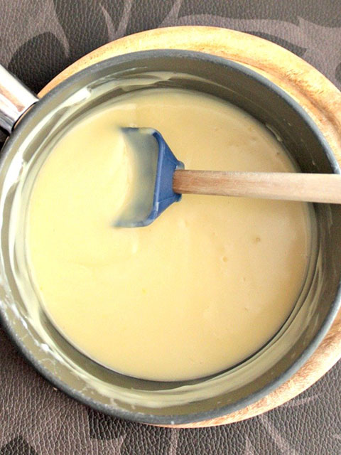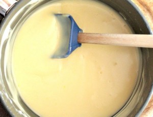 - Kada mlijeko zavrije sipajte smjesu od žumanjaka u mlijeko i stalno miješajte.