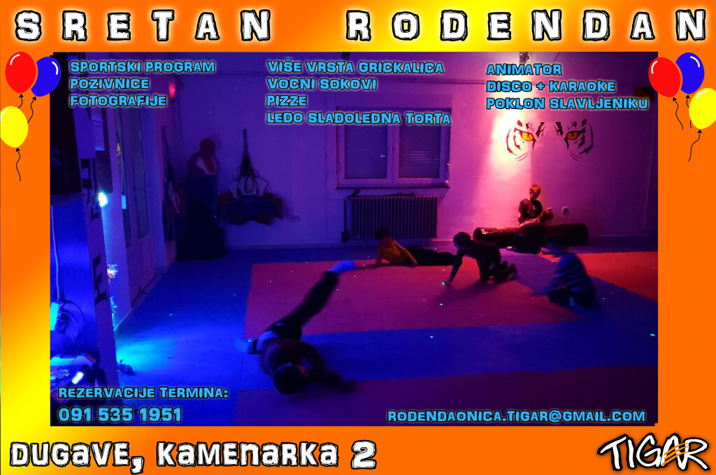 Program SPORTSKI ROĐENDANI provodi se u dvorani Tigar Centar, na adresi Kamenarka 2 u Dugavama. Program provode profesionalni treneri i animatori, koji imaju dugogodišnje iskustvo u provedbi istog programa.