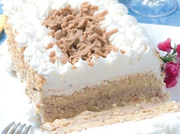 Kremu od oraha podijelite na tri dijela. Tortu slažete tako da prvu beze koru namažete kremom od oraha, zatim stavite kremu od kestena pa opet na nju kremu od oraha i na vrh drugu beze koru. Tortu izvana premažite ostatkom kreme od oraha i ukrasite šlagom. Za dekoraciju možete koristiti i gumene bombone, ribanu čokoladu ili čokoladne mrvice.